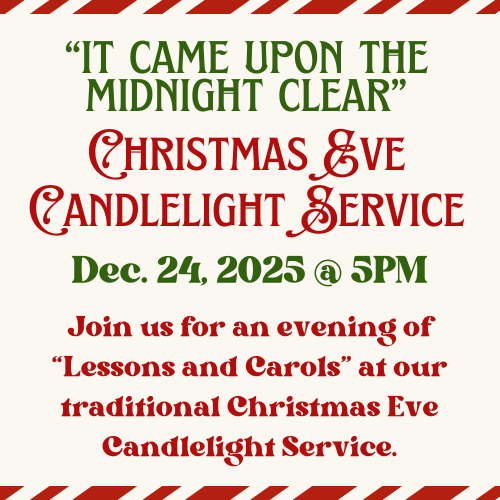 Please join us for a special candlelight worship service at 5:00 pm on Christmas Eve. The service will be held in the church sanctuary and streamed live on Zoom. All are welcome!